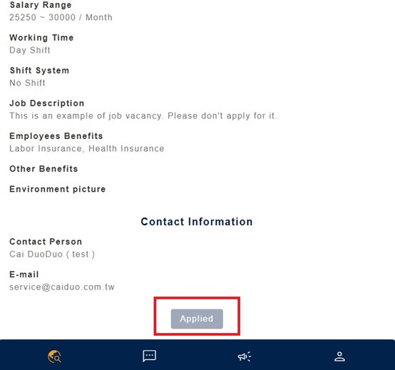 - You can click the job you’ve applied, scroll down to the bottom, and you’ll see the “Applied”, it means you’ve applied the job.