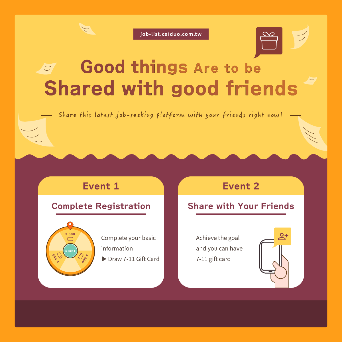 1. If I’ve shared 5 people last month, then I’ll get first layer prize, 7-11 Gift Card NT$500. If I only shared 10 people until next month, then I’ll get 7-11 Gift Card NT$500 two months later.