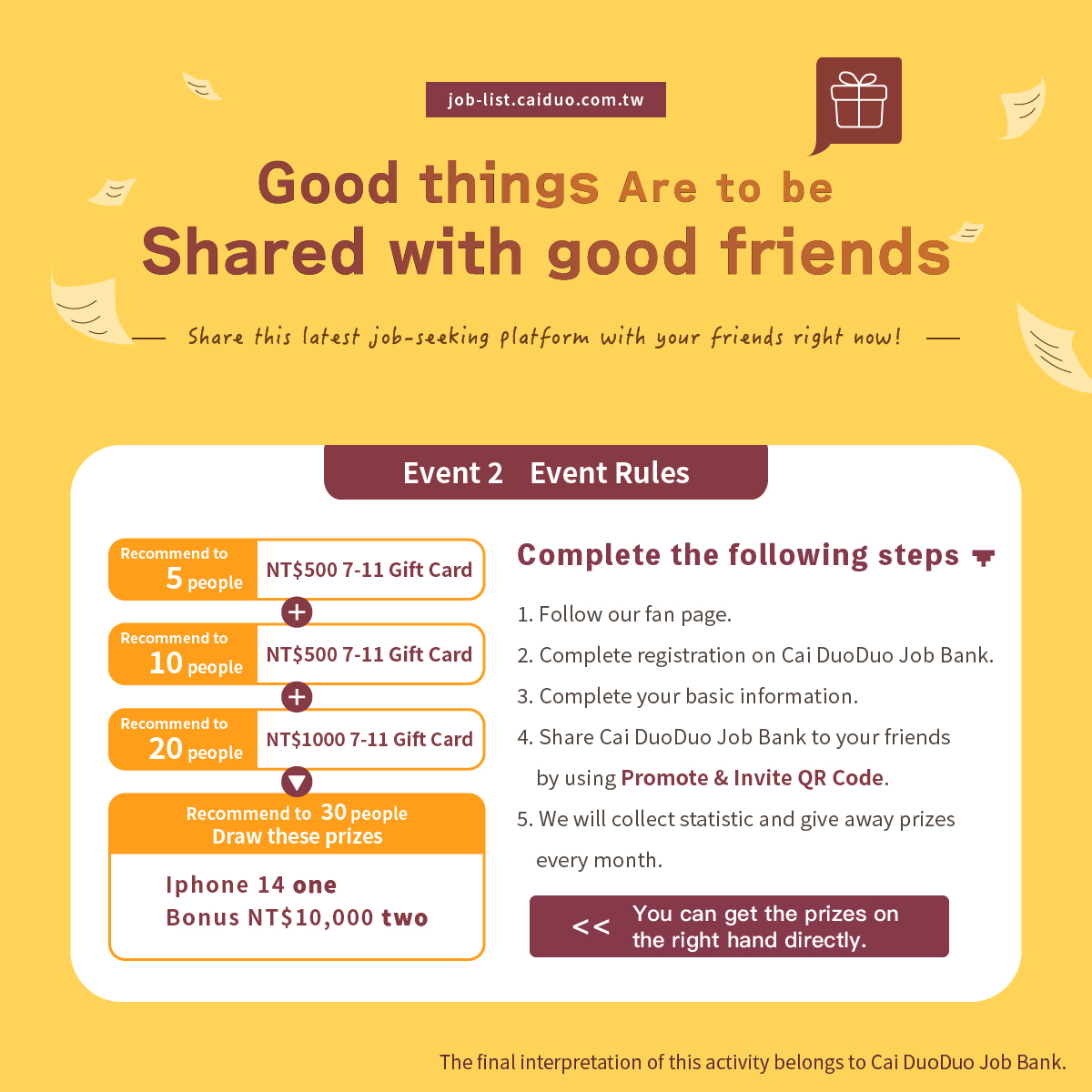 6. Cai DuoDuo Job Bank has the right to verification participants and cancel, terminate, modify or suspend the event and announce it on Cai DuoDuo Job Bank. If there are other unfinished maters, the final interpretation of this activity belongs to Cai DuoDuo Job Bank.